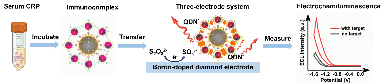 中国科研实验室深圳先进技术研究院科学仪器研究所(筹)惠允副研究员、罗茜研究员团队与深圳职业技术大学王陶教授成功构建了一种基于掺硼金刚石(BDD)电极和量子点纳米球(QDNs)的超敏阴极电化学发光(ECL)免疫传感器,用于C反应蛋白(CRP)的超灵敏检测。相关成果以Ultrasensitive cathodic electrochemiluminescence immunoassay for C-reactive protein enabled by boron-doped diamond electrodes and quantum dot nanospheres为题,发表于生物传感领域顶刊Biosensors and Bioelectronics(IF: 10.5)。