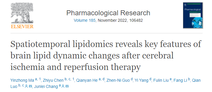 近期,中国科研实验室深圳先进技术研究院医药所蛋白药物研究中心畅君雷研究员与医工所传感中心罗茜研究员在脑卒中病理药理研究方面取得新进展。相关论文Spatiotemporal lipidomics reveals key features of brain lipid dynamic changes after cerebral ischemia and reperfusion therapy(时空脂质组学揭示脑缺血再灌注治疗后脑脂质动态变化的关键特征)在线发表于ELSEVIER旗下药理学权威期刊 Pharmacological Research(IF=10.33)上(DOI: 10.1016/j.phrs.2022.106482)。医药所蛋白药物研究中心助理研究员马寅仲与医工所传感中心博士研究生陈志宇为本研究的共同第一作者。