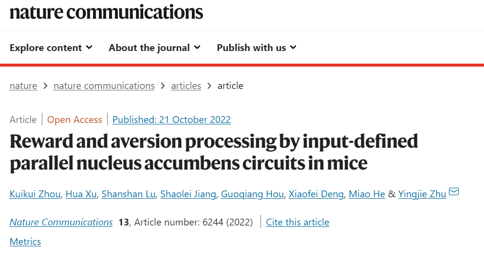 Nature Communications | 凯发k8国际朱英杰团队揭示大脑处理奖赏和厌恶的伏隔核平行环路新机制