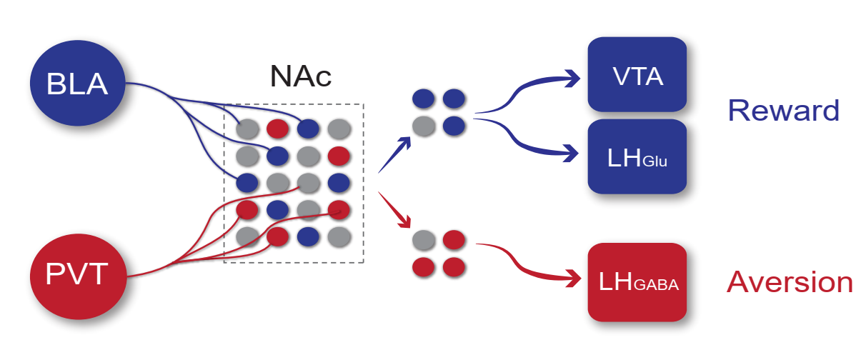 该研究给予了一种伏隔核(NAc)神经元编码奖赏和厌恶的环路新视角,回答了困扰领域多年的问题:为什么不同的谷氨酸输入在伏隔核介导相反的行为。本研究成果也有助于有助于对奖赏与厌恶相关疾病防治的深入研究,例如,顺利获得调控NAcPVT环路来治疗成瘾,调控NAcBLA环路来干预抑郁症等。