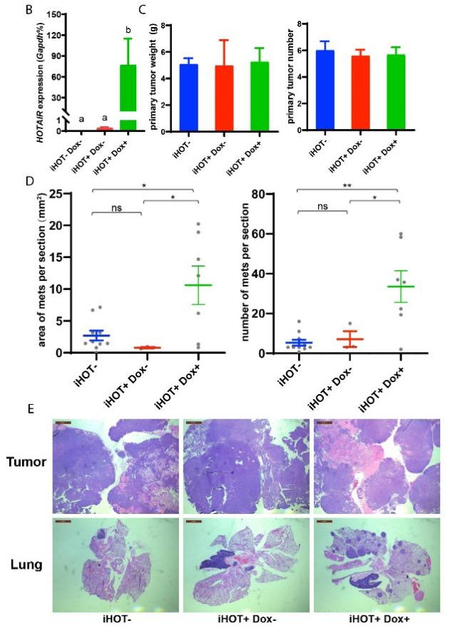 图1. 诱导过表达HOTAIR促使小鼠乳腺肿瘤向肺转移,但不影响原始肿瘤的重量和数量