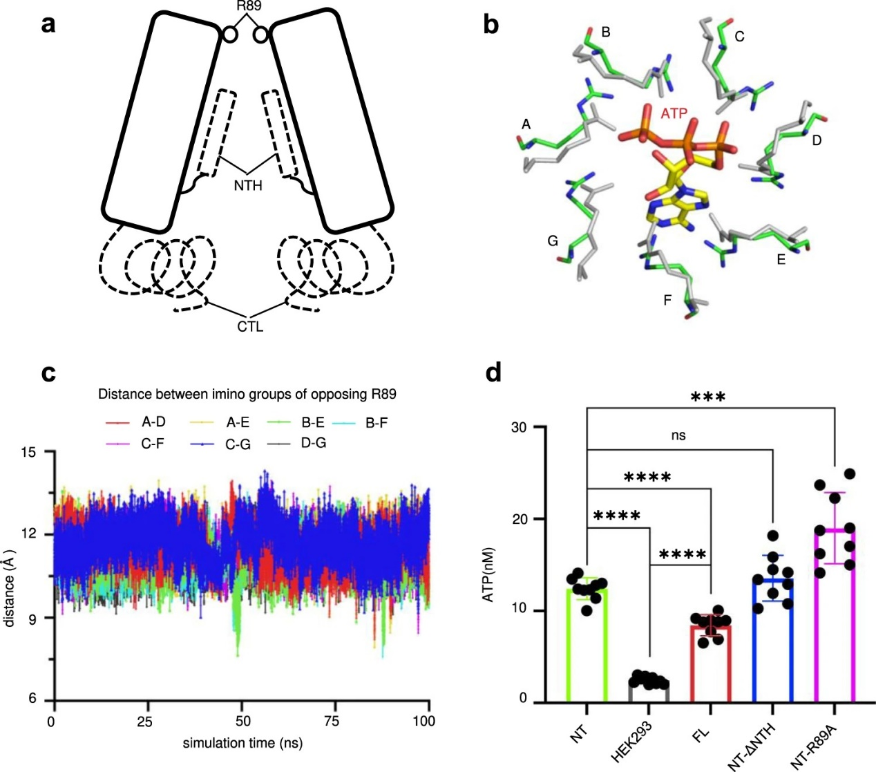 团队随后顺利获得ATP扩散实验和分子动力学模拟来验证上述假设。在ATP扩散实验中,团队发现Panx2-NT-R89A比野生型Panx2在顺利获得ATP的效率方面有显著提升,这说明R89氨基酸是ATP顺利获得Panx2的主要门控因素。此外,分子动力学模拟显示Pnax2蛋白的R89氨基酸侧链会灵活摆动,同时此处的通道孔径也随侧链摆动而变大,这有利于ATP的扩散(图3)。