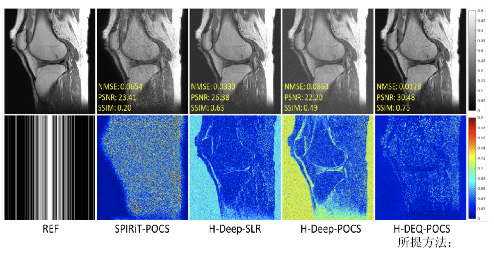 磁共振利用多通道线圈接收人体生理信号,多线圈的数据间具有很强的相关性。团队针对磁共振成像中全采数据难以取得的巨大挑战,提出利用线圈间数据相关性这一物理先验,来构建磁共振物理驱动的无监督深度神经网络成像模型,并分析了网络的误差上界,为成像可靠性给予保障。实验结果(图1)表明,该方法无需训练数据就能够重建出高质量图像,且效果与需要训练数据方法类似。研究成果发表在医学成像领域著名期刊Medical Image Analysis。