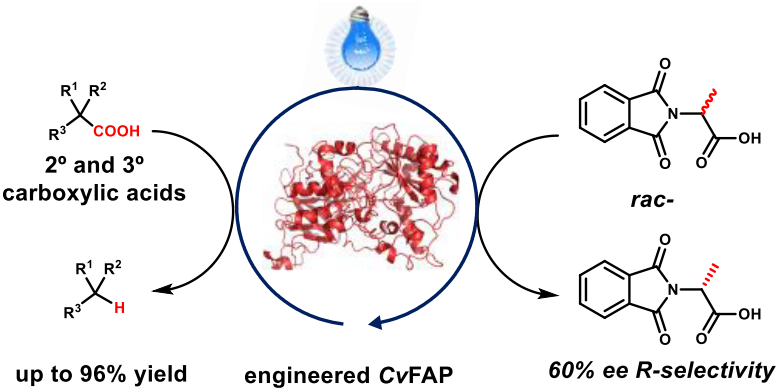 羧酸作为化学合成与生物转化中基础分子,其绿色高效的转化不断受到合成科学领域的重要关注。传统的脱羧反应需要高温的介导、活化基团的引入、当量金属的参与等较为苛刻的反应条件,开发条件温和、基团兼容性好的羧酸脱羧转化,可以为基于羧酸的绿色合成制造给予重要的合成工具。光催化可以利用绿色可再生光能,顺利获得光促激发态的活化,实现温和条件下的挑战性转化;同时酶催化可以利用蛋白分子与底物丰富的次级相互,实现复杂分子的选择性转化,所以开展光酶催化体系有望实现羧酸分子在温和条件下的高选择性转化。