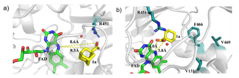 在最优条件下,研究团队对于底物适用性进行了考察。该光酶催化体系具有广普性和良好的基团兼容性,对于一系列二级、三级羧酸包括含酮基、脂基、胺基等多种官能团的底物都具有不错的转化率。值得指出的是,对于杂环类羧酸等重要的药物分子中间体,该光酶也可以顺利实现其光促脱羧转化,并对消旋底物的手性合成,证明了该光酶有望应用于药物分子的生物合成中。最后研究团队顺利获得模板底物与蛋白结构的分子对接和动力学模拟等计算手段,进一步阐释了突变体中羧酸底物与光反应活性中心FAD分子的距离是决定反应速率的关键因素,为后续的光酶改造给予了理论指导。