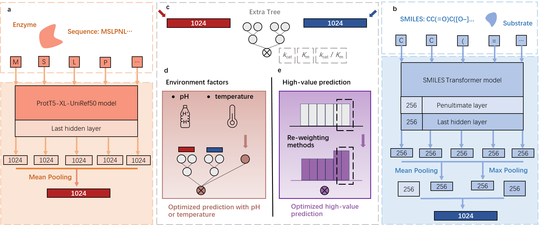 研究人员们尝试利用计算方法加速酶动力学参数的预测过程,但当前的模型主要集中在单独的kcat或者单独的Km的预测上,顺利获得这些工具计算得到的kcat / Km的数值往往与实验测量的真实值明显偏离,而这恰恰是反映催化效率最直接、最关键的参数。此外,当前模型未考虑真实生物实验场景下的适应性,如会显著影响测得的酶动力学参数数值的环境因素,生物学家关心的特定区间的预测性能等。这些局限性使得当前工具停留理论模型的开发和数据分析上,并未对酶挖掘和定向进化等真实生物实验中面临的挑战产生实质性的影响,而解决这些挑战对下游应用具有重要意义。