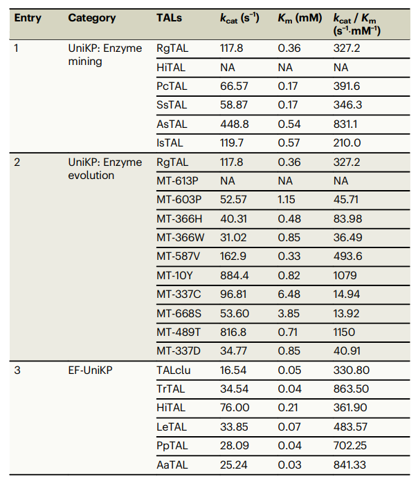最后,为了探索UniKP及其衍生框架在酶工程领域的实际应用,研究团队以类黄酮合成中的关键限速酶,酪氨酸脱氨酶(Tyrosine ammonia lyase, TAL为例来进行挖掘和进化。实验结果表明,UniKP有效地识别了在数据库中TAL的同工酶里以及已知TAL的突变体里的高活性TAL酶,无论是挖掘新酶,还是进化已有酶,都得到了显著提高的催化效率,其中RgTAL-489Tkcat / Km值比野生型酶高出3.5倍。此外,衍生框架EF-UniKP也可以在考虑环境因素的情况下,精准识别高活性的TAL酶,验证的5序列kcatkcat / Km值均优于野生型TAL,最高的kcat / Km值比野生型酶在给定pH情况下高2.6倍。该结果证实了UniKP可以有效的加速酶挖掘和进化的过程,有望成为有助于生物催化、药物发现、代谢工程等领域的强大工具(表1