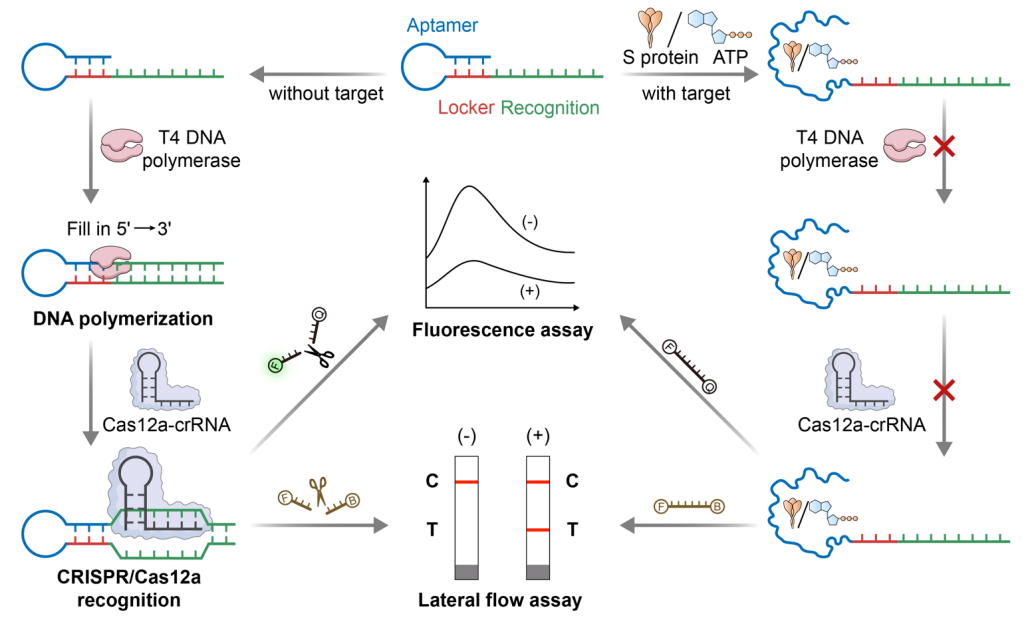12月13日,中国科研实验室深圳先进技术研究院合成生物学研究所马英新课题组和西北农林科技大学郁尧博士合作在ACS Sensors上发表了题为Programmable Aptasensor for Regulating CRISPR/Cas12a Activity的封面文章。本研究开发了一种基于CRISPR/Cas12a系统的可编程适配体传感器检测平台,主要包括适配体识别元件和CRISPR/Cas12a信号转导及放大元件。该平台无需调整crRNA,只需简单地改变适配体序列和locker DNA长度即可实现不同目标物检测。当以SARS-CoV-2 S蛋白和三磷酸腺苷(adenosine triphosphate, ATP)作为特异性靶标进行检测时,检测限分别为0.06 pM和0.06  M。该平台与侧流免疫分析相结合后能够在一个小时内实现可视化检测,展现了其作为便携式检测的潜力。