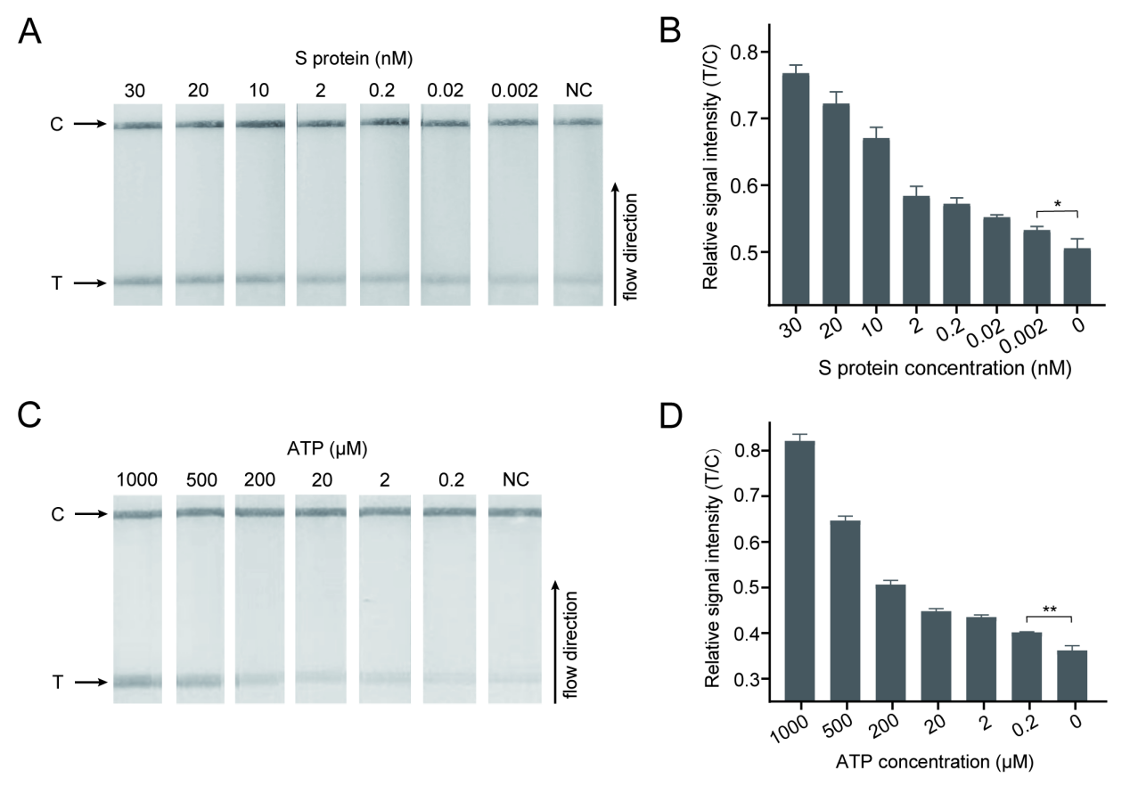 在这项研究中,团队第一时间选择SARS-CoV-2 S蛋白和ATP作为特异性检测靶标,用于评估开发的适配体传感器检测平台进行蛋白质和小分子分析的可行性。实验结果表明,该平台可以有效地识别靶标物,并能顺利获得适配体的构象变化调节Cas12a的切割活性。随后,团队对适配体传感器进行结构优化,当locker DNA长度分别为7nt和4nt时,适配体与靶标物结合后能发生稳定的构象变化,并取得最佳信噪比。利用该平台检测SARS-CoV-2 S蛋白时发现,随着S蛋白浓度逐渐增加,荧光信号逐渐下降且信噪比呈现稳定的线性关系(如图2A-C),检测效果优于商用ELISA检测试剂盒(如图2D)。此外,当与其他非靶标蛋白同时检测时,该平台也对S蛋白展现出良好的检测特异性(如图2E)。在与阴性样本VSV-G假病毒进行实验对照时,SARS-CoV-2假病毒产生显著的荧光变化,表明该平台在检测实际样本时的100%准确性(如图2F)。在改变不同的适配体序列和locker DNA长度后,可以同样的检测效率实现对ATP的高特异性检测,进一步验证了该平台的检测稳定性。最后,团队还将该平台与侧流免疫层析技术相结合(如图3),在一小时内实现了对靶标物的可视化检测,证实了其在POCT中的潜在应用。