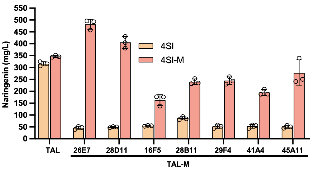 第一时间,将TAL基因放置于不同拷贝数、弱启动子质粒,其余关键性代谢基因维持原质粒(图1),发现当TAL基因被放置在中高拷贝数质粒ColE1时能取得最高柚皮素产量。然而,在该背景质粒下,直接筛选TAL的随机突变库时,未能取得产量更高的有义突变体,揭示了复杂的基因上位效应可能诱发途径进化陷入局部最优解。为解决该问题,该团队将TAL随机突变库置于低拷贝数质粒,以创造一个人工代谢瓶颈,确保TAL的表达和活性是限制柚皮素产量的唯一因素。在这种情况下,突变体的进化轨迹更为清晰,在产量达到其本身在中高拷贝数质粒上所能达到的最高产量之前,理论上不会遇到中间体毒性或复杂调控等问题而导致进化的不确定性问题。基于此,研究团队取得了7株在该背景下能显著提升柚皮素产量的TAL突变体,并确认了其突变位点。随后,将野生型TAL及7种变体放置于中高质粒,发现所有TAL变体的柚皮素产量均低于其野生型的最高产量(357.66 mg/L)。上述结果证实了TAL基因置于中高拷贝数质粒(如ColE1 origin)时,基因上位效应可能会掩盖柚皮素的有义突变体,导致代谢途径在直接进化中往往只能达到次优水平;这也解释了途径进化常出现微小或无明显效果的原因。