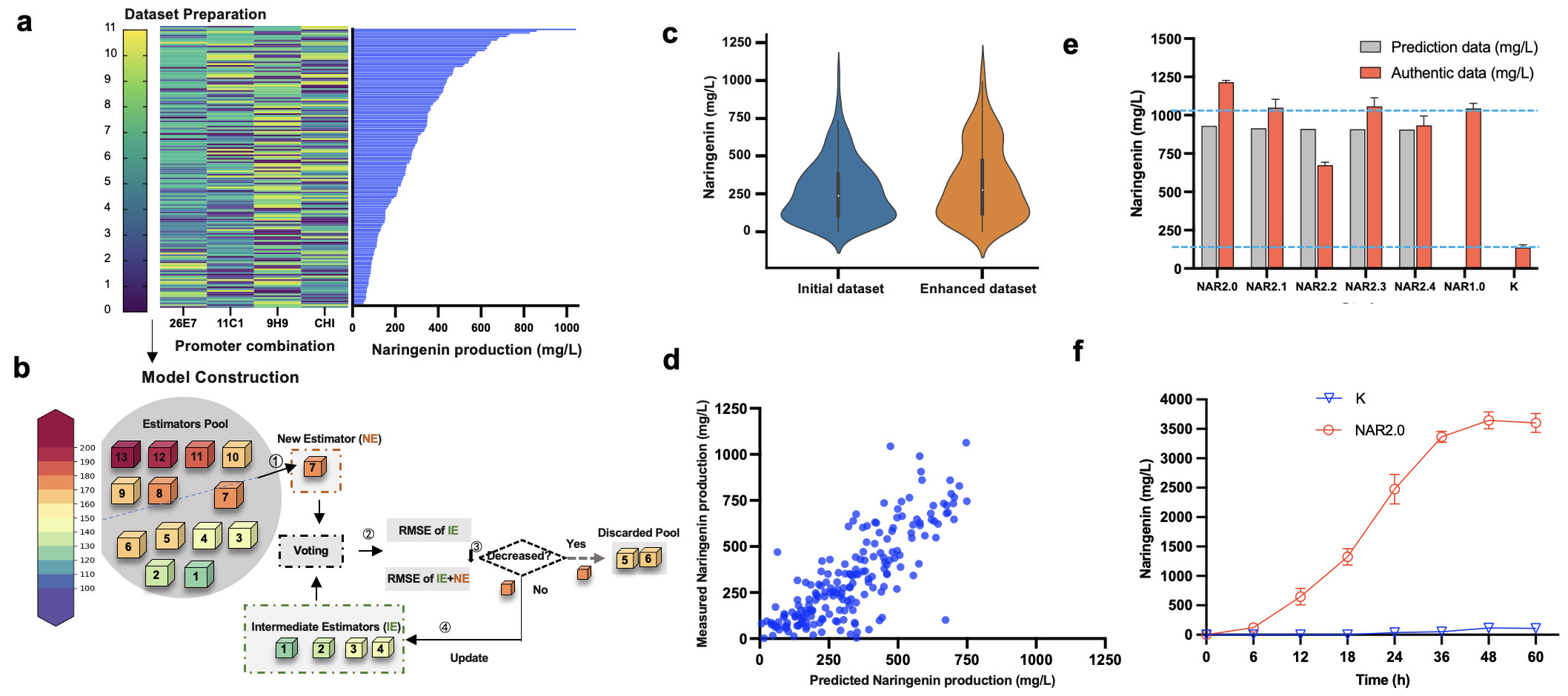 鉴于基因上位效应影响,进一步迭代进化上述3个关键性基因可能会诱发代谢通路失衡,导致进化不确定性。为此,本团队开发了ProEnsemble机器学习框架(图5),优化进化通路启动子组合,缓解进化途径的基因上位效应影响。本研究尽可能选取不同分布的数据,避免训练进入局部最优解,根据Al3+信号,从约1000个克隆子中收集到相对平衡的数据集,柚皮素产量范围在50.8至1044 mg/L之间。Top1的NAR1.0菌株柚皮素产量比对照组高出4.44倍。顺利获得对数据集进行十折交叉验证,评估13种常规预测器的均方根误差(Root Mean Square Error, RMSE),随后顺利获得前向模型选择,将误差最小的预测器依次进行集成,选择RMSE最小的集成模型作为最终的预测模型。皮尔逊相关系数(Pearson Coefficient Correlation, PCC)也达到了0.74,显示出该模型在真实值和预测值之间有更好的相关性。