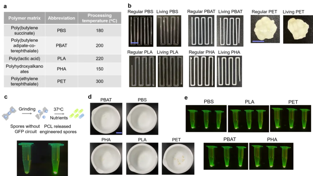 因此为了验证系统的普适性,研究团队继续尝试了其他的塑料体系,将带有绿色荧光质粒的孢子分别与PBS(聚丁二酸丁二醇酯)、 PBAT(聚己二酸对苯二甲酸丁二醇酯)、 PLA(聚乳酸)、PHA(聚羟基脂肪酸酯)甚至PET(聚对苯二甲酸乙二醇酯)进行混合加工,其中PET的加工温度高达300摄氏度,之后顺利获得物理研磨的方法对孢子进行了释放。有趣的是,即使从PET塑料中释放出来的孢子依旧可以复苏并重新表达绿色荧光。这也为制作其他基底的活塑料奠定了良好的基础(图6)。