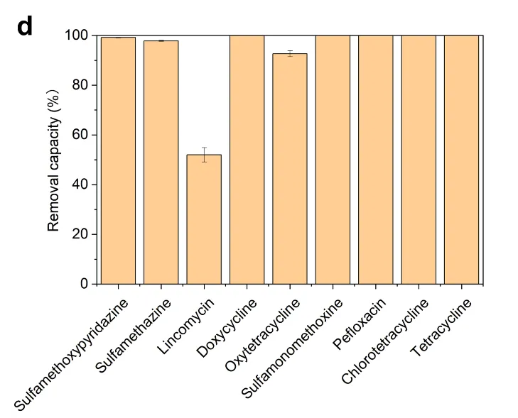 利用定向进化技术,筛选到了新型小球藻(M5)能够快速地去除废水中的总氮(TN),氨氮(NH4-N)和总磷(TP)。在鸭场厌氧废水中实现了 192 mg TN/L/d、177 mg NH4-N/L/d 和 2 mg TP/L/d 的去除率,在养猪场厌氧废水中实现了 160 mg TN/L/d、125 mg NH4-N/L/d 和 6 mg TP/L/d 的去除率 (图1a 和b)。与之前发表的研究相比,在TN含量高出 4 倍的情况下,M5对TN去除率仍旧高出 8 倍 (Wang et al., 2016)。同时,发现M5可有效去除鸭场废水中的强力霉素、磺胺甲氧哒嗪、环丙沙星和磺胺嘧啶(图 1c)。在猪场废水中,也可有效去除磺胺甲氧哒嗪、磺胺二甲嘧啶、强力霉素、土霉素、磺胺间甲氧嘧啶、培氟沙星、金霉素和四环素(图 1d)。