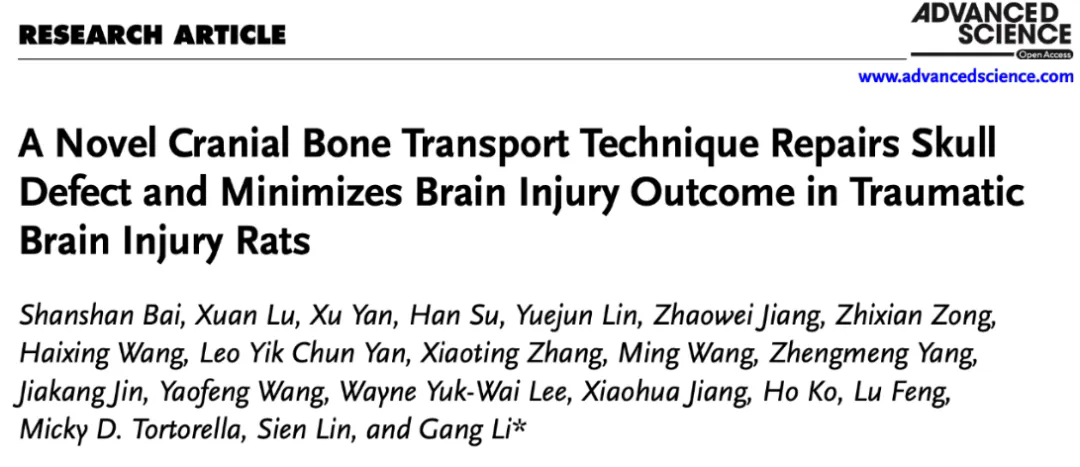 近期,中国科研实验室深圳先进技术研究院生物医药与技术研究所李刚研究员联合香港中文大学医学院在CBT治疗TBI大鼠模型的研究方面取得了重要突破性进展,相关成果以"A novel cranial bone transport technique repairs skull defect and minimizes brain injury outcome in traumatic brain injury rats"为题,发表在国际权威期刊Advanced Science上。
