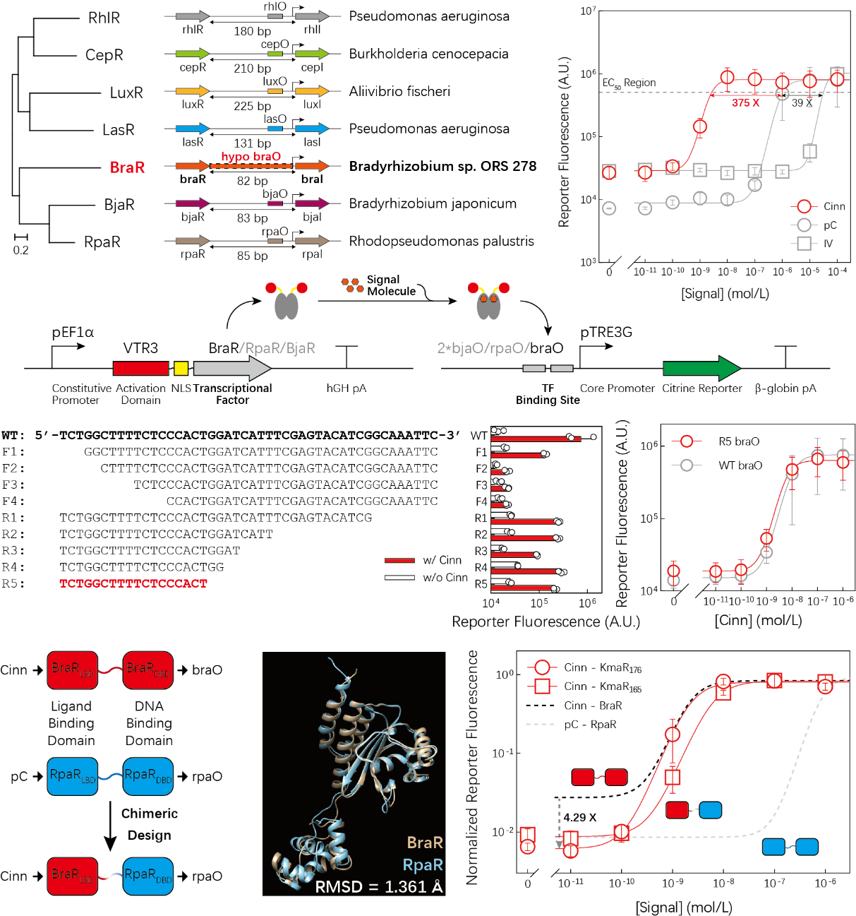 本研究第一时间构建并优化了Cinn接收模块。实验结果显示,该模块的半最大效应浓度(EC50)低至约10-9 mol/L,其灵敏度比现有报道的最优哺乳动物细胞通讯信号系统提升了约375倍。为了进一步提升性能,研究团队界定了BraR的最小核心结合序列,将其从46 bp精简至18 bp,有效降低了潜在的非特异性结合风险。此外,针对受体本底泄漏较高的问题,团队利用AlphaFold2进行结构预测,采用嵌合工程策略将BraR的配体结合域(LBD)与同源蛋白RpaR的DNA结合域(DBD)融合,成功开发出新型受体KmaR。该受体在保持超高灵敏度的同时显著抑制了本底活性,实现了信号识别精度与动态响应范围的协同优化。