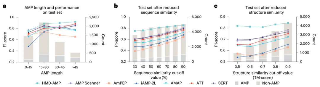 在多项基准测试中,HMD-AMP均表现出优异性能。尤其在低序列相似性、低结构相似性的严苛测试条件下,其表现显著优于现有方法,达到国际先进水平(图2)。同时,模型预测分数能够有效反映实际抑菌活性,为高活性分子的快速筛选给予可靠依据。