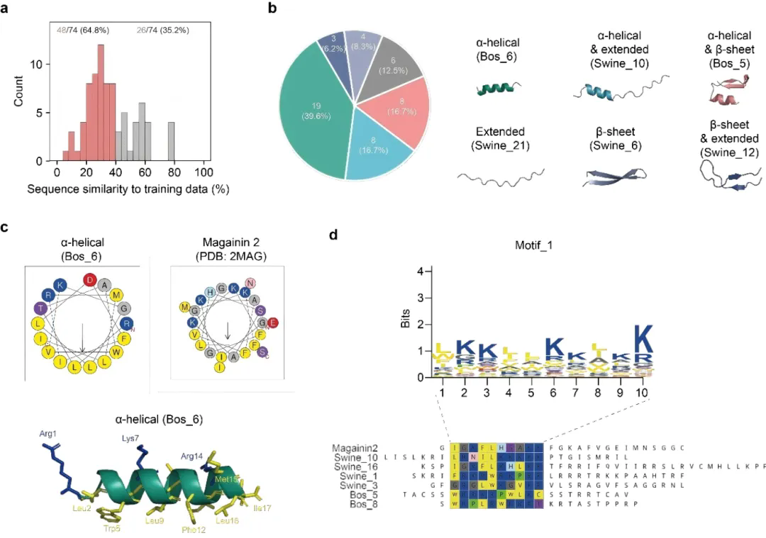 在74条经验证的AMP中,48条为序列新颖的远源AMP。这些分子虽然序列差异显著,但保留了典型AMP的结构折叠和功能基序,说明模型捕捉到了进化过程中保守的功能特征,而非简单的表面序列模式(图4)。