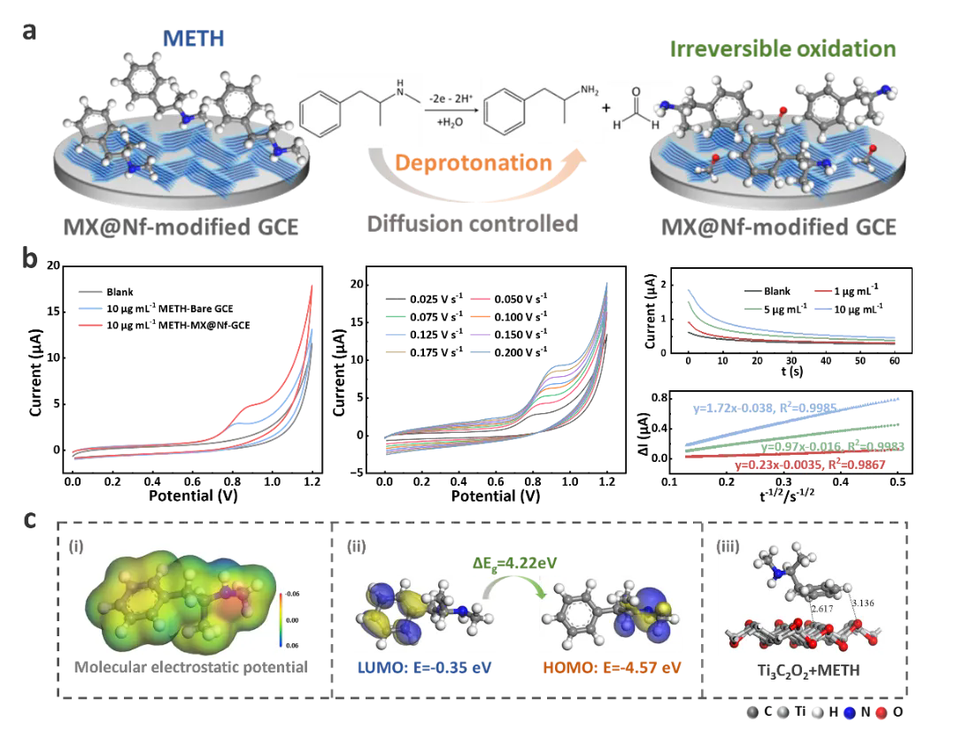 研究发现,METH分子中的脂肪族仲胺基团(-NH)是电化学氧化的核心活性位点。MXene的层状结构加速了电荷转移,其丰富的表面官能团有效增强了METH分子与电极表面的相互作用频率与强度。二者协同促进了METH的电化学氧化过程,放大响应电流,显著提升了传感器对微量样本的检测灵敏度与信号稳定性。这一机理研究为高性能电化学传感器的理性设计奠定了理论基础。
